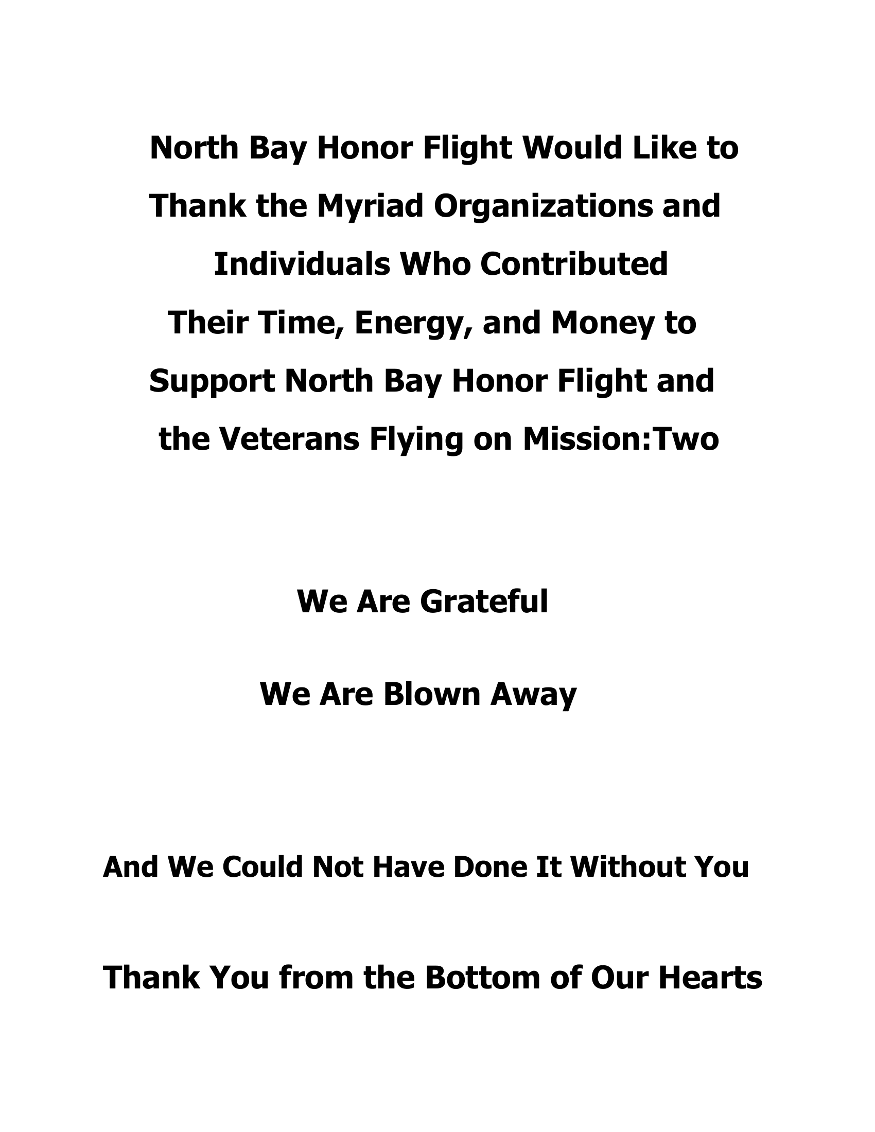 North Bay Honor Flight is a 501(c)(3) nonprofit organization and a member of the National Honor Flight Network which was established in 2005 with a powerful vision: to fly World War II veterans to Washington, D.C. to visit their military service war memorial and other significant war memorials and monuments. Since then the Honor Flight Network and its vision has grown nationwide to include veterans from the Korean War era and the Vietnam War era; flown more than 300,000 veterans to Washington, D.C.; and united communities across the United States of America.