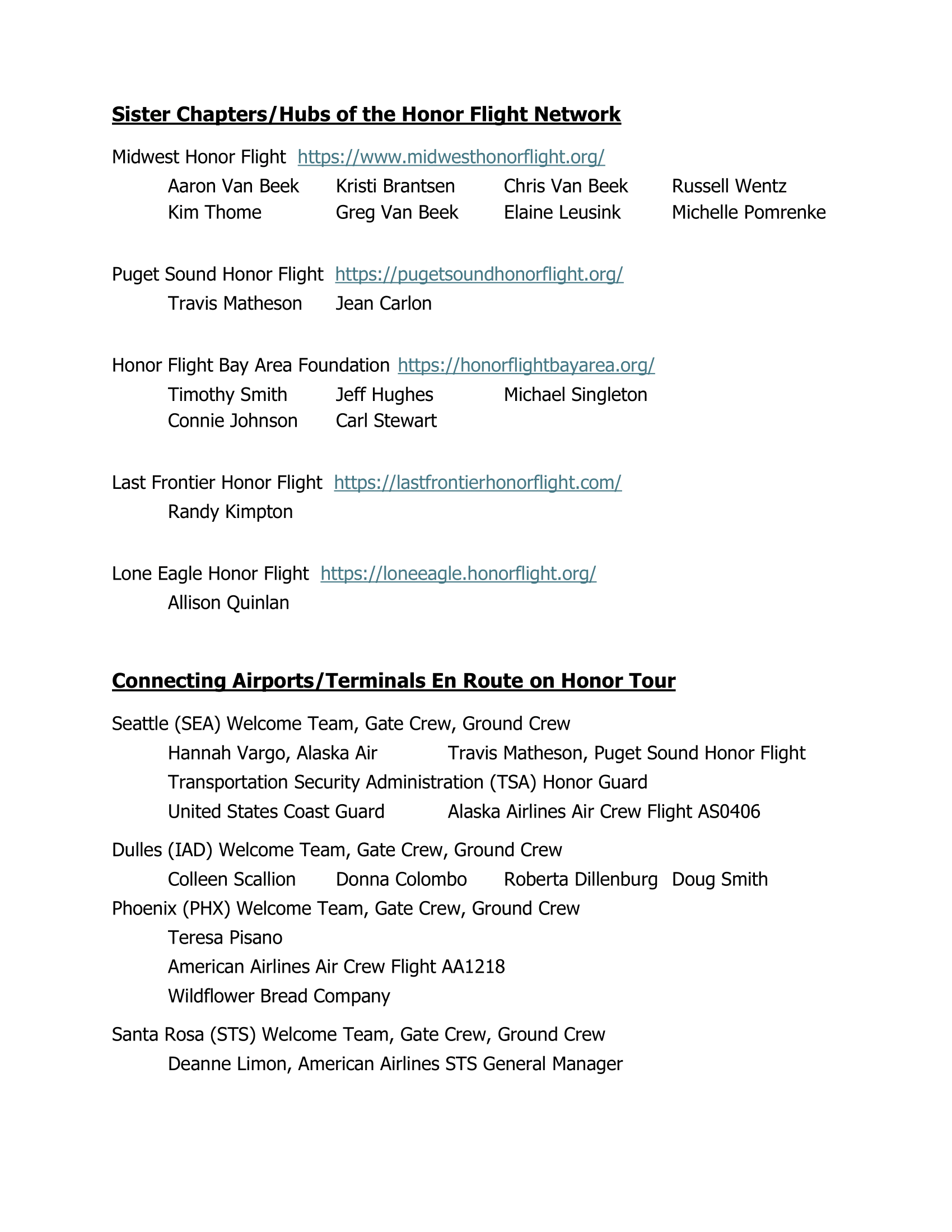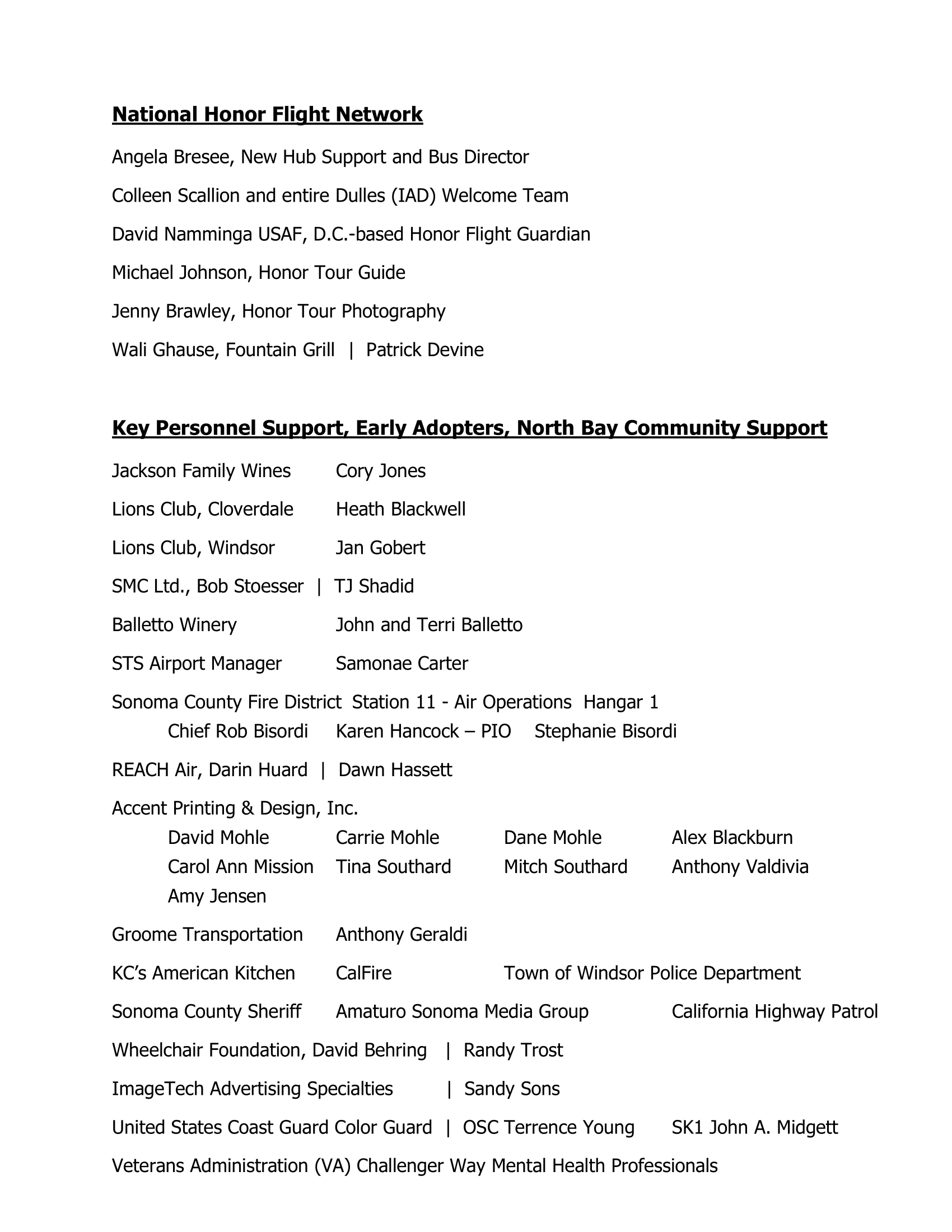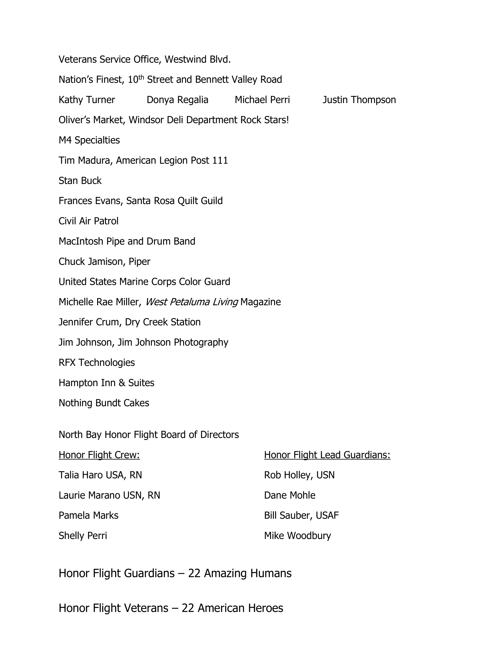 Established in 2023, the North Bay Chapter of the Honor Flight Network is one of 131 nationwide chapters and serves veterans from the Northern California counties of Sonoma, Napa, Marin, Mendocino, Lake, Humboldt, Del Norte, and Trinity.